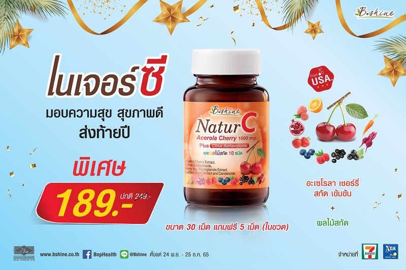 “บีไชน์ เนเจอร์ซี” ขนาดบรรจุ 30 เม็ด (แถมฟรีอีก 5 เม็ดในขวด) จัดโปรโมชั่นสุขคุ้มเวอร์ ส่งท้ายปี ลดราคาพิเศษ เหลือเพียง 189 บาท จากปกติ ราคา 249 บาท ตั้งแต่วันนี้ – 25 ธันวาคม 2565 หาซื้อได้ที่ร้านเซเว่น อีเลฟเว่น ทุกสาขาทั่วประเทศ สามารถดูข้อมูลเพิ่มเติมได้ที่ http://www.bshine.co.th, FB : https://www.facebook.com/BnpHealth และ Line : @Bshine