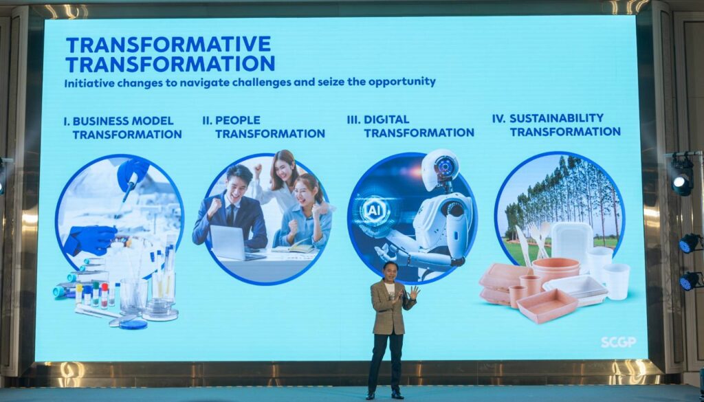 “วิชาญ จิตร์ภักดี” ประธานเจ้าหน้าที่บริหาร บริษัทเอสซีจี แพคเกจจิ้ง จำกัด (มหาชน) หรือ SCGP เปิดประเด็นว่า โลกกำลังเปลี่ยนแปลงอย่างรวดเร็ว หากธุรกิจไม่ปรับตัวจะไม่สามารถแข่งขันได้ ซึ่ง SCGP ได้ปรับตัวมาอย่างต่อเนื่อง โดยเฉพาะ Sustainability Transformation ถือเป็นดีเอ็นเอของเอสซีจี โดย SCGP ตั้งเป้าหมายลดการปล่อยก๊าซเรือนกระจกลง 25% ภายในปี 2030 และ Net Zero ภายในปี 2050 ผ่านการดำเนินงานใน 2 ด้านหลัก ได้แก่ การประเมินคาร์บอนฟุตพริ้นท์ขององค์กรหรือ CFO (Carbon Footprint for Organization) หันมาใช้พลังงานเชื้อเพลิงที่ปล่อยก๊าซคาร์บอนไดออกไซด์ต่ำ โดยติดตั้งโซลาร์รูฟ และใช้พลังงานชีวมวลแทนพลังงานถ่านหิน นำเทคโนโลยีปัญญาประดิษฐ์เข้ามาเพิ่มประสิทธิภาพเพื่อใช้พลังงานน้อยลงและสามารถลดการปล่อยก๊าซเรือนกระจก 1 ล้านตัน ปลูกต้นไม้สะสมจำนวน 2.3 ล้านต้น นำขยะพลาสติกมาหลอมเป็นเมล็ดพลาสติกใหม่ นำเศษเยื่อกระดาษจากกระบวนการผลิตไปทำสารปรับปรุงดิน 24,000 ตันต่อปี เพื่อนำไปปลูกต้นยูคาลิปตัสสำหรับผลิตกระดาษต่อไป