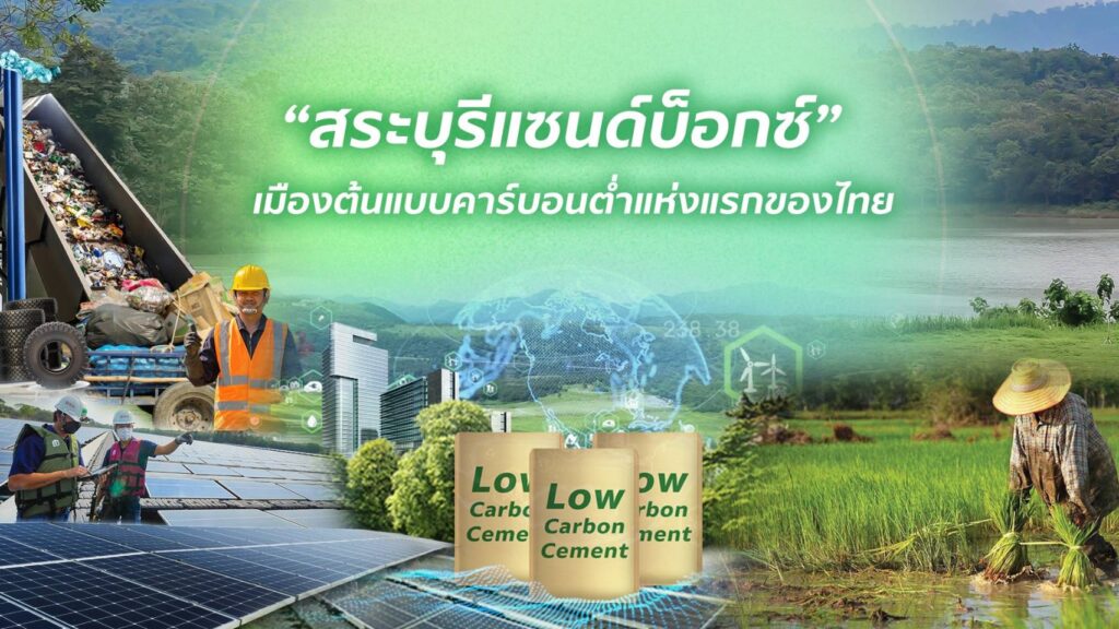 นอกจากนี้ เอสซีจี ร่วมกับภาครัฐ เอกชน และประชาสังคม ขับเคลื่อน ‘สระบุรีแซนด์บ็อกซ์’ เมืองต้นแบบคาร์บอนต่ำแห่งแรกของไทยเพื่อลดการปล่อยก๊าซเรือนกระจก 5 ด้าน ได้แก่ 1) เปลี่ยนผ่านสู่พลังงานสะอาดจากศักยภาพพื้นที่และสายส่งด้วยระบบโครงข่ายไฟฟ้าอัจฉริยะ (Grid Modernization) 2) มุ่งสู่อุตสาหกรรมสีเขียว ผลิตสินค้ารักษ์โลกและคาร์บอนต่ำ 3) สร้างมูลค่าเพิ่มจากของเหลือใช้ 4) การทำนาแบบเปียกสลับแห้ง ลดใช้น้ำ ลดคาร์บอน 5) เพิ่มพื้นที่สีเขียว ท่องเที่ยวเชิงอนุรักษ์ พร้อมทั้งหาทุนสีเขียว (Green Funding) จากต่างประเทศมาพัฒนานวัตกรรมคาร์บอนต่ำ อาทิ เทคโนโลยีดักจับและใช้ประโยชน์จากคาร์บอน (Carbon Capture Utilization and Storage: CCUS) เพื่อมุ่งสร้างเศรษฐกิจเติบโตแบบโลว์คาร์บอน ตั้งเป้าปี 2573 ลดการปล่อยก๊าซเรือนกระจกของจังหวัดสระบุรี 5 ล้านตันคาร์บอนไดออกไซด์เทียบเท่า หนุนอุตสาหกรรมปูนซีเมนต์บรรลุเป้าหมายปล่อยก๊าซเรือนกระจกสุทธิเป็นศูนย์ ภายในปี 2593