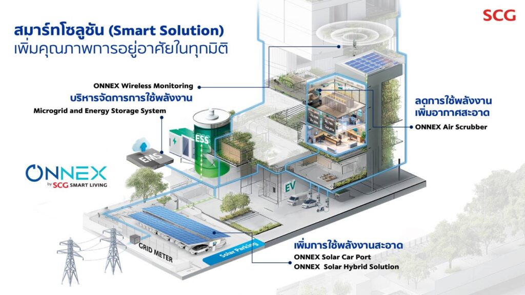 เดินหน้าสมาร์ทโซลูชัน New S-curve จากแบรนด์ ‘ออนเนกซ์ (ONNEX)’ ที่ผสานความเชี่ยวชาญของเอสซีจีและเทคโนโลยีล้ำสมัย ยกระดับการอยู่อาศัยทุกมิติ ทั้งประหยัดพลังงาน ด้วยระบบบำบัดอากาศเสีย ‘Air Scrubber’ และโซลูชันพลังงานสะอาด ‘Solar Hybrid Solutions’ ดูแลคุณภาพอากาศในบ้านและอาคาร ‘Bi-on’ ในอนาคตจะเพิ่มโซลูชันดูแลผู้สูงอายุ ตอบเทรนด์สังคมผู้สูงอายุ พร้อมเตรียมเชื่อมต่อกับทุกโซลูชันของออนเนกซ์ให้สามารถบริหารจัดการได้ในแพลตฟอร์มเดียว ผ่าน ระบบปฏิบัติการดิจิทัล ‘Trinity’ เพิ่มความสะดวกให้ผู้ใช้งานมากขึ้น