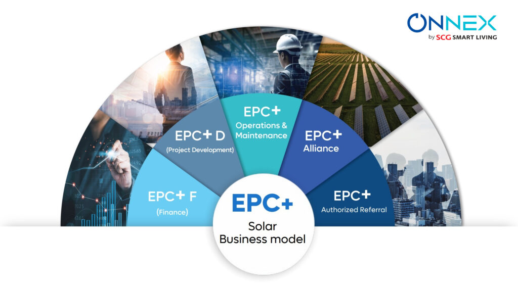 นายดุสิต ชัยรัตน์ Smart Home Living Solution Director ธุรกิจเอสซีจี สมาร์ทลีฟวิ่ง กล่าวว่า ด้วยแนวโน้มตลาดที่เปลี่ยนไป ทั้งด้วยนโยบายจากภาครัฐและจากความต้องการของลูกค้าในการใช้พลังงานสะอาด อีกทั้งในระยะหลังมีนักลงทุนที่สนใจลงทุนในธุรกิจพลังงานสะอาดมากขึ้นจากผลตอบแทนการลงทุนที่ดีและมีความผันผวนต่ำในระยะยาว ทาง ONNEX by SCG Smart Living ได้จัดให้มีบริการ EPC (Engineering Procurement and Construction) ทั้งด้านการออกแบบทางวิศวกรรม การขออนุญาตโครงการ รวมถึงการติดตั้งโครงสร้างระบบแบบครบวงจรอยู่แล้ว เพื่อขยายตลาดให้เติบโตขึ้นอย่างแข็งแกร่ง จึงได้เตรียมกลยุทธ์ EPC+ Business Model ที่ออกแบบมาเป็นพิเศษสำหรับผู้เกี่ยวข้องแต่ละกลุ่มในระบบโซลาร์ ที่จะช่วยสร้าง ecosystem ให้แข็งแกร่งเพื่อสนับสนุนการเติบโตของธุรกิจโซลาร์ให้สามารถตอบโจทย์ได้ทั้งกลุ่มธุรกิจ ผู้ประกอบการ และนักลงทุน ส่งผลดีให้กับกลุ่มผู้บริโภค เพื่อลดภาวะโลกร้อนและสร้างความมั่นคงทางพลังงานให้กับประเทศ โดยคาดว่า EPC+ Business Model จะสามารถเพิ่มกำลังการผลิตติดตั้งในระบบพลังงานโซลาร์รวมแล้วไม่น้อยกว่า 1,000 เมกะวัตต์ ภายใน 5 ปี”