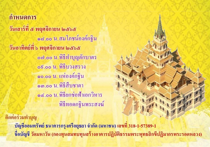 เจ้าวรเทวี ณ ลำพูน ชลวณิช คณะลูกหลานเจ้านายฝ่ายเหนือ พร้อมครอบครัวญาติธรรม และนาวาอากาศเอก(พิเศษ)คัมภีร์ คัมภีรญาณนนท์ ประธานกรรมการบริหาร บริษัท เมืองเศรษฐกิจพอเพียง จำกัด, ประธานคณะปวงชนชาวไทย เพื่อชาติ ศาสน์ กษัตริย์ และประธานฝ่ายฆราวาส สภาประชาชนแห่งชาติ ขอเชิญร่วมทอดมหากฐินสามัคคีอิ่มบุญ เพื่อสมทบทุนสร้างมหามณฑปพุทธสิกขีปฏิมากรพระรอดหลวง และร่วมพิธียกช่อฟ้าเอก บูรณะวิหารวัดมหาวัน ทอดถวาย ณ วัดมหาวัน ต.ในเมือง อ.เมือง จ.ลำพูน ในวันอาทิตย์ที่ 6 พฤศจิกายน 2565 เวลา 14.00 น.