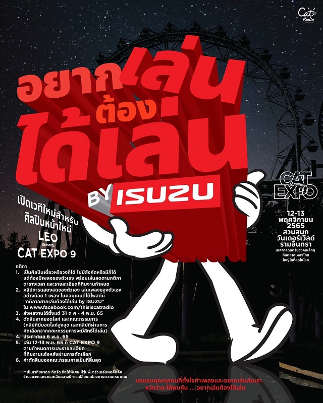 6.เล่นวันที่ 12-13 พ.ย. 65 ที่งาน Cat Expo 9 เวที Drive Stage By ISUZU อยากเล่นต้องได้เล่นตามกําหนดการและรายละเอียดที่ทีมงานแจ้งหลังผ่านการคัดเลือก