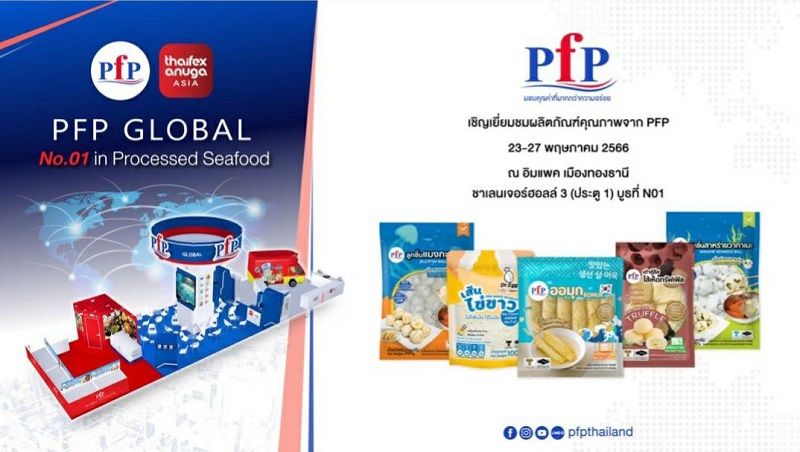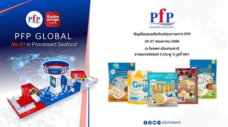 พีเอฟพี ผู้นำด้านการผลิตและจัดจำหน่ายผลิตภัณฑ์อาหารทะเลแปรรูปครบวงจร ชูความเป็นอันดับ 1 ในเรื่องคุณภาพ ความหลากหลายในผลิตภัณฑ์อาหารทะเลแปรรูปแช่แข็ง ร่วมผลักดันมูลค่าการส่งออกอาหารไทย ตาม Concept “PFP GLOBAL” ในงาน THAIFEX ANUGA ASIA 2023 ระหว่างวันที่ 23 – 27 พฤษภาคม 2566 ที่บูธ N01-M14 อาคารชาเลนเจอร์ 3 ศูนย์แสดงสินค้าและการประชุม อิมแพ็ค เมืองทองธานี