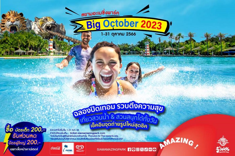ได้เวลาสนุกแล้วสิ!! สยามอะเมซิ่งพาร์คฉลองปิดเทอม รวบตึงความสุขไว้ในที่เดียวกับเทศกาล Big October 2023 ระหว่างวันที่ 1 – 31 ตุลาคม 2566 สนุกแบบฉ่ำ ๆ ได้ทั้งครอบครัวกับสวนน้ำและทะเลเทียมที่ใหญ่ที่สุดในโลก รับรองโดยกินเนสเวิลด์เรคคอร์ด เครื่องเล่นตัวท็อปมาตรฐานสากลกว่า 20 รายการ