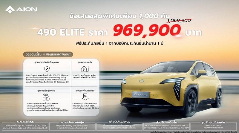 GAC AION ประกาศอย่างเป็นทางการเพื่อเป็นการขอบคุณและตอบแทนลูกค้า GAC AION มอบโปรโมชั่นส่วนลดพิเศษ 100,000 บาท สำหรับลูกค้าที่ซื้อ AION Y Plus รุ่น 490 Elite ตั้งแต่วันที่ 20 ตุลาคม 2566 จำกัดเพียง 1,000 คัน สำหรับลูกค้าที่ทำการส่งมอบรถเท่านั้น