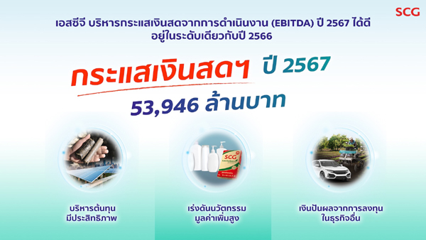 งบการเงินรวมก่อนตรวจสอบของเอสซีจี ประจำปี 2567 EBITDA 53,946 ล้านบาท จากการบริหารจัดการต้นทุนอย่างมีประสิทธิภาพ จากกลุ่มธุรกิจที่เกี่ยวข้องกับซีเมนต์และผลิตภัณฑ์ก่อสร้าง และเงินปันผลรับจากการลงทุนในธุรกิจอื่น (SCG Investment) ขณะที่ รายได้จากการขาย 511,172 ล้านบาท เพิ่มขึ้น 2% จากปีก่อน จากปริมาณขายที่เพิ่มขึ้นของเอสซีจีซี และ เอสซีจีพี