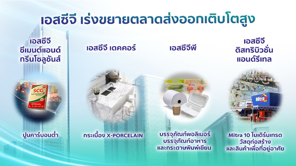 ขณะเดียวกัน เอสซีจี รุกขยายตลาดส่งออกใหม่ ๆ ที่มีศักยภาพ เช่น อเมริกาเหนือ ออสเตรเลีย โดย เอสซีจี ซีเมนต์แอนด์กรีนโซลูชันส์ เร่งดันปูนคาร์บอนต่ำ คาดว่าปีนี้จะมียอดส่งออกได้อีกประมาณ 1 ล้านตัน ด้าน เอสซีจี เดคคอร์ ส่งออกกระเบื้อง X- PORCELAIN ความแข็งแรงสูง ได้ผลตอบรับดี ตั้งเป้าการส่งออกเติบโต 2 เท่าในปีนี้ ขณะที่ เอสซีจีพี ส่งออกบรรจุภัณฑ์พอลิเมอร์ บรรจุภัณฑ์อาหาร และกระดาษพิมพ์เขียน มีแนวโน้มเติบโตต่อเนื่อง