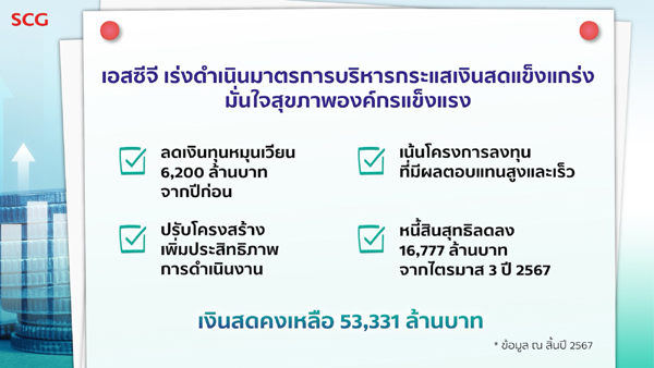 เอสซีจี มุ่งสร้างสุขภาพองค์กรให้แข็งแรง ด้วยการรักษากระแสเงินสด ซึ่งเป็นหัวใจสำคัญของการบริหารธุรกิจ ที่ผ่านมาได้เดินหน้ามาตรการเสริมความเข้มแข็ง ซึ่งได้แถลงไปเมื่อสิ้นไตรมาส 3 ปี 2567 มีความคืบหน้าเป็นอย่างดี 1.) บริหารจัดการเงินทุนหมุนเวียน ลดลงประมาณ 6,200 ล้านบาทจากปีก่อน 2.) ปรับโครงสร้างการดำเนินงานและธุรกิจ และหยุดธุรกิจที่ไม่ทำกำไรในปี 2567 เพื่อเพิ่มประสิทธิภาพการทำงาน 3.) ควบคุมเงินลงทุน (CAPEX) เน้นเฉพาะโครงการที่มีผลตอบแทนสูงและเร็ว ทั้งหมดนี้ ส่งผลให้หนี้สินสุทธิลดลง 16,777 ล้านบาท จากไตรมาสก่อน อัตราหนี้สินสุทธิต่อส่วนของผู้ถือหุ้นเท่ากับ 0.7 เท่า สถานะทางการเงินยังมั่นคงและแข็งแกร่ง โดยมีเงินสดคงเหลือ ณ สิ้นปี 53,331 ล้านบาท