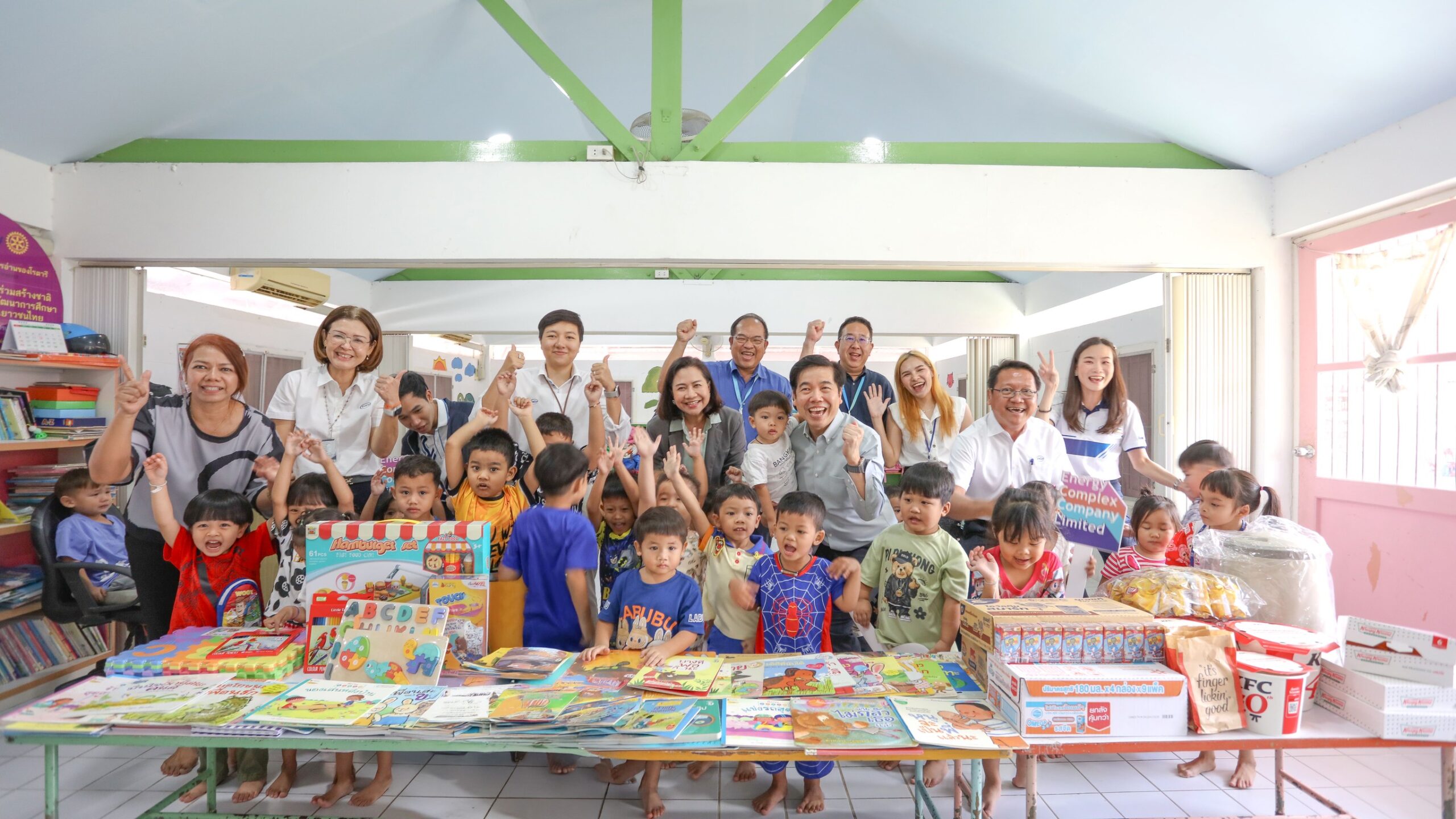 คุณศิรศักดิ์ จันเทรมะ กรรมการผู้จัดการใหญ่ บริษัท เอนเนอร์ยี่ คอมเพล็กซ์ จำกัด (EnCo) พร้อมด้วยคณะผู้บริหาร ร่วมส่งมอบหนังสือเรียนเสริมพัฒนาการให้กับศูนย์เด็กเล็กและโรงเรียนในพื้นที่การดำเนินงานของ EnCo ทั้ง 3 แห่ง ได้แก่ ศูนย์เด็กเล็กก่อนวัยเรียน กม.11 กรุงเทพมหานคร ศูนย์พัฒนาเด็กเล็กบ้านยุบตาเหน่ง อ.วังจันทร์ จ.ระยอง และโรงเรียนวัดโพธิ์ อ.บางปะอิน ต.บ้านโพ จ.พระนครศรีอยุธยา ภายใต้กิจกรรม “เล่มใหม่ให้น้อง” ปีที่ 3 โดยผู้บริหารและพนักงานในกลุ่มบริษัท ปตท. ร่วมกันส่งต่อหนังสือสภาพดีที่ไม่ได้ใช้แล้ว นำมาจำหน่ายให้กับกลุ่มผู้เช่าและพนักงานภายในศูนย์เอนเนอร์ยี่คอมเพล็กซ์ ซึ่งรายได้จากการจำหน่ายดังกล่าวได้นำไปจัดซื้อหนังสือเล่มใหม่ พร้อมทั้งอุปกรณ์การเรียนและอาหาร รวมถึงยังได้รับการสนับสนุนจาก บริษัท นานมีบุ๊คส์ จำกัด ในการสมทบทุนจัดซื้อหนังสือเล่มใหม่ให้กับเด็ก ๆ