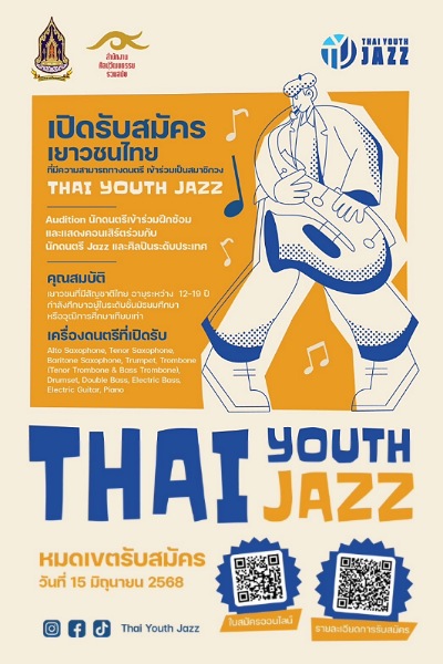 ผู้ช่วยรัฐมนตรีประจำกระทรวงวัฒนธรรม กล่าวอีกว่า โครงการส่งเสริมเยาวชนด้านดนตรี Thai Youth Jazz ประจำปีงบประมาณ พ.ศ. 2568 เปิดรับสมัครเด็กและเยาวชนไทยอายุระหว่าง 12 – 19 ปี กำลังศึกษาไม่เกินระดับชั้นมัธยมศึกษาปีที่ 6 หรือมีวุฒิการศึกษาเทียบเท่า ซึ่งเป็นผู้ที่มีทักษะด้านดนตรีทั้งการอ่านโน้ตเพลงและสามารถเล่นเครื่องดนตรีชนิดใดชนิดหนึ่ง ได้แก่ กลอง เบสไฟฟ้า ดับเบิ้ลเบส เปียโน อัลโตแซกโซโฟน เทเนอร์แซกโซโฟน บาริโทนแซกโซโฟน ทรัมเป็ต ทรอมโบน (เทนเนอร์ทรอมโบนและเบสทรอมโบน) เข้าร่วมโครงการฯ เปิดรับสมัครตั้งแต่วันที่ 19 พฤษภาคมจนถึงวันที่ 15 มิถุนายน 2568 ซึ่งเยาวชนไทยที่ได้รับคัดเลือกเข้าร่วมโครงการฯ จะได้เข้าอบรมเพื่อเรียนรู้เทคนิคการเล่นดนตรีและฝึกปฏิบัติกับนักดนตรี นักแต่งเพลงมืออาชีพและอาจารย์สถาบันอุดมศึกษาที่มีความรู้ความเชี่ยวชาญด้านดนตรีแจ๊ส และดนตรีแขนงอื่นๆ รวมทั้งฝึกซ้อมการแสดงดนตรีเพื่อแสดงคอนเสิร์ตร่วมกับนักร้องและศิลปินเพลงแจ๊สที่มีชื่อเสียงระดับประเทศ ทั้งนี้ ผู้ที่สนใจสามารถสอบถามรายละเอียดโครงการฯเพิ่มเติมที่ Inbox ในเพจเฟซบุ๊ก Thai Youth Jazz