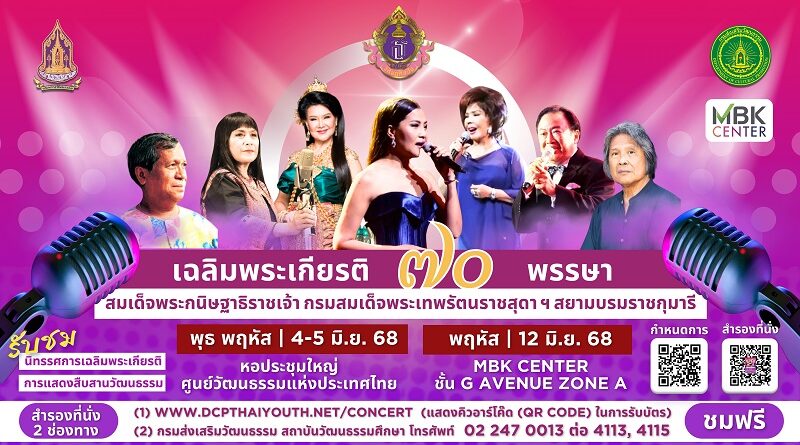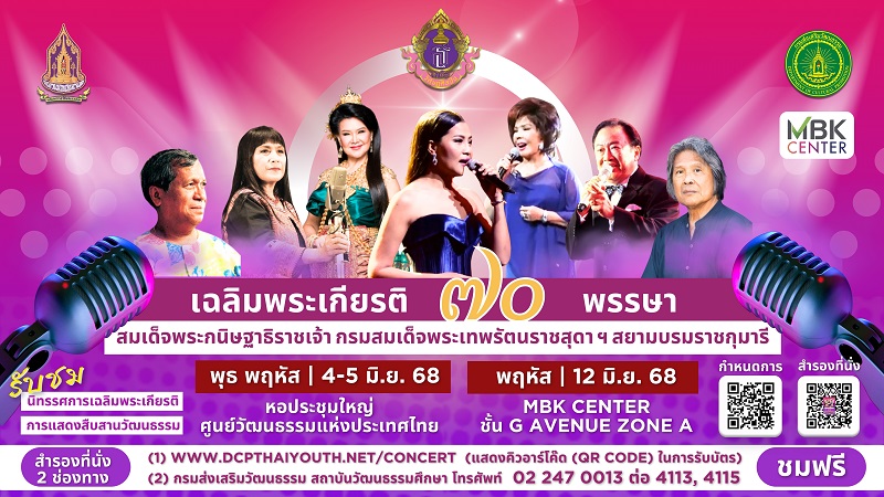 กระทรวงวัฒนธรรม โดยกรมส่งเสริมวัฒนธรรม จัดงานเฉลิมพระเกียรติ ๗๐ พรรษา สมเด็จพระกนิษฐาธิราชเจ้า กรมสมเด็จพระเทพรัตนราชสุดาฯ สยามบรมราชกุมารี มีวัตถุประสงค์เพื่อเฉลิมพระเกียรติสมเด็จพระกนิษฐาธิราชเจ้ากรมสมเด็จพระเทพรัตนราชสุดาฯ สยามบรมราชกุมารี ในโอกาสทรงเจริญพระชนมายุ ๗๐ พรรษา โดยเน้นการเทิดพระเกียรติพระองค์ในฐานะ “วิศิษฏศิลปิน” และ “เอกอัครราชูปถัมภกมรดกวัฒนธรรมไทย” ซึ่งทรงมีพระปรีชาสามารถและพระอัจฉริยภาพในหลายแขนง ทั้งด้านวรรณศิลป์ ทัศนศิลป์ และศิลปะการแสดง อีกทั้งงานนี้ยังสะท้อนถึงพระมหากรุณาธิคุณของพระองค์ที่มีต่อวงการศิลปวัฒนธรรมไทย ผ่านการจัดแสดงพระราชกรณียกิจ และผลงานที่ทรงอนุรักษ์และส่งเสริมไว้ รวมถึงการเปิดโอกาสให้ศิลปินแห่งชาติ ศิลปินพื้นบ้านและเครือข่ายทางวัฒนธรรมได้ร่วมแสดงความจงรักภักดีและสืบสานมรดกทางวัฒนธรรมของชาติ ผ่านบทเพลงและการแสดงทางวัฒนธรรม ซึ่งจัดงานฯ ในวันที่ ๔-๕ มิถุนายน ๒๕๖๘ ณ ศูนย์วัฒนธรรมแห่งประเทศไทย และวันที่ ๑๒ มิถุนายน ๒๕๖๘ ณ Avenue ชั้น G ศูนย์การค้า เอ็ม บี เค เซ็นเตอร์ ประชาชนและผู้ที่สนใจเข้าร่วมงาน สามรถติดตามรายละเอียดได้ทางเฟสบุ๊ค กรมส่งเสริมวัฒนธรรม, เฟสบุ๊ค ศูนย์วัฒนธรรมแห่งประเทศไทย หรือสอบถามได้ที่หมายเลขโทรศัพท์ ๐๒-๒๔๗-๐๐๑๓ ต่อ ๔๑๑๓ และ ๔๑๑๕