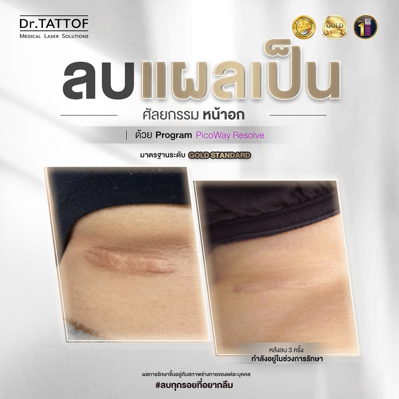 Scar Clinic ของ Dr.TATTOF ให้บริการด้วยการนำเทคโนโลยีเลเซอร์ชั้นนำระดับโลก มาใช้ในการ ให้บริการ ได้แก่ โปรแกรม PicoWay Resolve Laser และ โปรแกรม Vbeam Laser ซึ่งถูกพัฒนาขึ้น เพื่อตอบโจทย์การรักษาแผลเป็นทุกประเภท ไม่ว่าจะเป็นแผลเป็นจากศัลยกรรม อุบัติเหตุ หลุมสิว หรือแผลเป็น คีลอยด์ และรอยแดง นวัตกรรมเหล่านี้ช่วยกระตุ้นการสร้างคอลลาเจนในชั้นผิว ฟื้นฟูสภาพผิว และลดรอย แผลเป็นได้อย่างมีประสิทธิภาพ นอกจากนี้ Dr.TATTOF ยังได้รับการรับรองมาตรฐานสถานพยาบาล ระดับสากลจาก American Accreditation Commission International (AACI) เพื่อยืนยันถึงคุณภาพ และความปลอดภัยสูงสุดในการให้บริการอีกด้วย