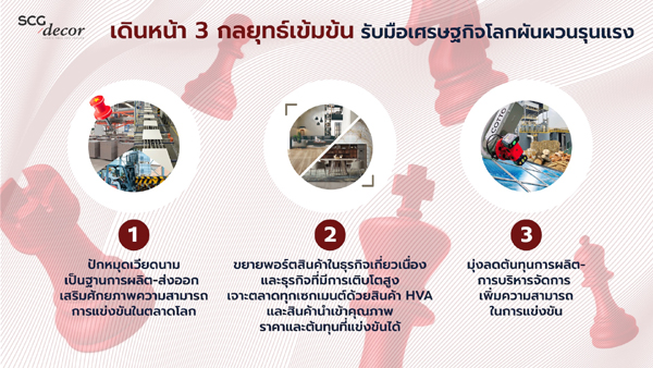 จากการที่บริษัทปรับตัวเชิงรุกพร้อมรับมือความผันผวน เดินหน้าติดตามสถานการณ์เศรษฐกิจโลกและในประเทศอย่างใกล้ชิด ทำให้มั่นใจว่าธุรกิจจะสามารถคว้าโอกาสจากความท้าทายจากเศรษฐกิจได้ด้วย 3 กลยุทธ์เข้มข้น ดังนี้ 1.) ปักหมุดเวียดนามเป็นฐานการผลิต-ส่งออก เสริมศักยภาพความสามารถการแข่งขันในตลาดโลก โดยเวียดนามเริ่มผลักดันต้นทุนการผลิตกระเบื้องให้เทียบเท่ากับผู้เล่นระดับโลกได้แล้ว อีกทั้งเร่งเพิ่มกำลังการผลิตกระเบื้องเกรซ พอร์ซเลนกว่า 25% ของกำลังการผลิตรวม ส่งผลให้เวียดนามมีปริมาณการขายกระเบื้องเกรซ พอร์ซเลนสูงขึ้นสอดคล้องกับความนิยมและความต้องการของตลาด เตรียมพร้อมเป็นฐานการผลิตเพื่อส่งออก รองรับการเติบโตของภูมิภาค 2.) ขยายพอร์ตสินค้าในธุรกิจเกี่ยวเนื่อง และธุรกิจที่มีการเติบโตสูง เจาะตลาดทุกเซกเมนต์ด้วยสินค้า HVA และสินค้านำเข้าคุณภาพ ราคาและต้นทุนที่แข่งขันได้ อาทิ กลุ่มสินค้ามูลค่าเพิ่มสูง (HVA) ปัจจุบันบริษัทมียอดขายกลุ่ม HVA กว่า 37% ของรายได้จากการขายเทียบกับปีก่อนที่ 34% อีกทั้งขยายพอร์ตสินค้าในธุรกิจเกี่ยวเนื่องในไทย ที่จะเพิ่มโอกาสความหลากหลาย (Sourcing) ตอบโจทย์กลุ่มที่มีความต้องการเฉพาะเจาะจง 3.) มุ่งลดต้นทุนการผลิต-การบริหารจัดการ เพิ่มความสามารถในการแข่งขัน ได้แก่ ลดต้นทุนการผลิตแล้วกว่า 36 ล้านต่อปี ด้วยโครงการการใช้พลังงานทดแทนจากแสงอาทิตย์และเชื้อเพลิงชีวมวลที่แล้วเสร็จในปีนี้ อีกทั้งโครงการเพิ่มประสิทธิภาพการผลิตเพิ่มเติมอาทิ โครงการติดตั้งระบบ Hot Air Generator ที่โรงงานนิคมหนองแค ทดแทนการใช้เชื้อเพลิงฟอสซิล