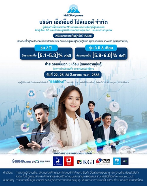 บริษัท เอ็ชเอ็มซี โปลีเมอส์ จำกัด หรือ “HMC Polymers” ผู้ผลิตเม็ดพลาสติกโพลีโพรพิลีน หรือ PP รายแรกและรายใหญ่ที่สุดในประเทศไทย และชั้นนำในภูมิภาคเอเชียตะวันออกเฉียงใต้ ดำเนินธุรกิจ มายาวนานกว่า 42 ปี มีผู้ถือหุ้นใหญ่ คือ บริษัท พีทีที โกลบอล เคมิคอล จำกัด (มหาชน) หรือ “GC” เตรียมเสนอขาย หุ้นกู้ 2 รุ่น คือ รุ่น 2 ปี และรุ่น 3 ปี 6 เดือน สำหรับผู้ลงทุนรายใหญ่ และผู้ลงทุนสถาบัน (ไม่รวมถึงบุคคลธรรมดาที่เป็น ผู้ลงทุนสถาบัน) ในช่วงเดือนสิงหาคม 2568 นี้ ผ่าน 7 สถาบันการเงินชั้นนำ ได้แก่ รุ่น 2 ปี : ธนาคารกรุงเทพ จำกัด (มหาชน) ธนาคาร ซีไอเอ็มบี ไทย จำกัด (มหาชน) บริษัทหลักทรัพย์ เอเซีย พลัส จำกัด และบริษัทหลักทรัพย์ บลูเบลล์ จำกัด / รุ่น 3 ปี 6 เดือน : ธนาคารกรุงเทพ จำกัด (มหาชน) บริษัทหลักทรัพย์ เอเซีย พลัส จำกัด บริษัทหลักทรัพย์ บลูเบลล์ จำกัด บริษัทหลักทรัพย์ เคจีไอ (ประเทศไทย) จำกัด (มหาชน) บริษัทหลักทรัพย์ ซีจีเอส อินเตอร์เนชั่นแนล (ประเทศไทย) จำกัด และบริษัทหลักทรัพย์ กรุงไทย เอ็กซ์สปริง จำกัด