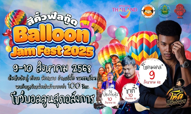 การท่องเที่ยวแห่งประเทศไทย ร่วมกับ อำเภอสีคิ้ว องค์การบริหารส่วนตำบลมิตรภาพ กรมชลประทาน และ บริษัท เดอะ ไมโครโฟน จำกัด เตรียมจัดงาน “Balloon Jam Fest 2025 สีคิ้วฟีลกู๊ด” ที่อ่างซับประดู่ ตำบลมิตรภาพ อำเภอสีคิ้ว จังหวัดนครราชสีมา ระหว่างวันที่ 9 – 10 สิงหาคม 2568