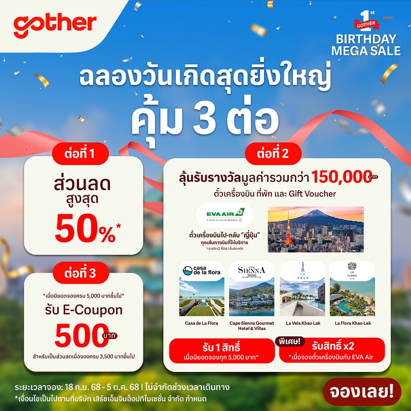 นายอนุพงษ์ กล่าวต่อไปว่า การดำเนินงานของGother ได้รับการสนับสนุนจาก บีคอน เวนเจอร์ส แคปิทัล บริษัทเงินร่วมลงทุนของธนาคารกสิกรไทย และ กรุงไทย เวนเจอร์ส บริษัทเงินร่วมลงทุนของธนาคารกรุงไทย เพื่อเสริมศักยภาพและตอบสนองความต้องการของนักท่องเที่ยวไทย พร้อมสนับสนุนการเติบโตของอุตสาหกรรมท่องเที่ยวไทย ปัจจุบันเปิดตัวมาแล้วกว่า 1 ปี มีความมุ่งมั่นพัฒนาแพลตฟอร์มให้เป็นแพลตฟอร์มจองท่องเที่ยวที่ 1 ในใจของคนไทย ที่มีบริการการท่องเที่ยวที่ครบวงจร และตอบโจทย์การใช้งานของคนไทยทั้งประเทศ สำหรับผู้ที่สนใจโปรโมชั่นสามารถดูรายละเอียดได้ที่ ข้อมูลเพิ่มเติม Link: https://www.gother.com/th-th/promotions/gother-birthday-2025