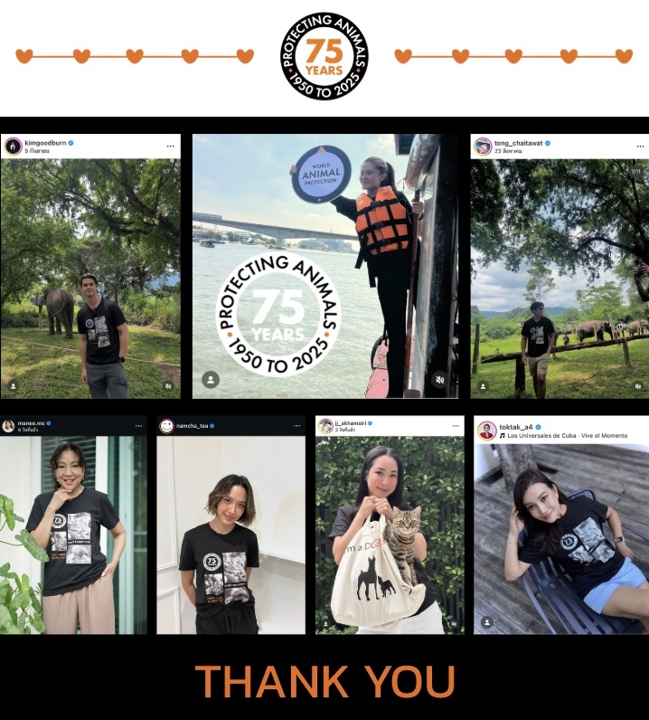 องค์กรพิทักษ์สัตว์แห่งโลกขอขอบคุณเหล่าศิลปิน ดารา-คนดัง พร้อมใจกันร่วมภารกิจเพื่อเพื่อนร่วมโลก ภายใต้แคมเปญ 75 ปี World Animal Protection โดยต่างสวมเสื้อยืดขององค์กรที่มีข้อความ “Don’t Forget Them” เพื่อร่วมเป็นพลังสำคัญในการส่งต่อเสียงแห่งความกรุณาครั้งนี้ เพื่อจุดประกายให้สังคมหันมาเห็นคุณค่าของชีวิตสัตว์ นำทีมโดย มารีญา พูลเลิศลาภ ทูตองค์กรฯ ประเทศไทย, พร้อมด้วยนักแสดงและเหล่าคนดังหลากหลายวงการ อาทิ คิม-ธิติสรรค์ กู้ดเบิร์น Mister International 2023 พิธีกร นักแสดง, น้ำชา-ชีรณัฐ ยูสานนท์ , ครูอ้วน มณีนุช เสมรสุต, ต่าย-เพ็ญพักตร์ ศิริกุล , ตั๊ก-มยุรา เศวตศิลา ,แพนเค้ก-เขมนิจ และมิกิ-อิงกมล จามิกรณ์ , จั๊กจั่น-อคัมย์สิริ สุวรรณศุข , เต๋า-เศรษฐพงศ์ เพียงพอ , ฌอน-ชวนล ไคสิริ ดีไซเนอร์แบรนด์ POEM , หนูดี วนิษา เรซ , แม็กซีน อินทิพร แต้มสุขิน , แซมมี่ เคาวเวลล์ , ต๋อง-ชัยธวัช ไพศาลศิริ, ใบตอง-จรีรัตน์ เพชรโสม Miss Earth Thailand 2021 ,ต๊อกแต๊ก A4 และเหล่าอินฟลูเอนเซอร์สายกรีน อาทิ ฟิล์ม เพจ Smile bear, พิม เพจ Green Civil, หวาน เพจ Vegan Calendar เป็นต้น