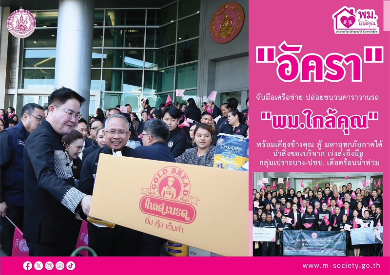 นายอัครา พรหมเผ่า รัฐมนตรีว่าการกระทรวงการพัฒนาสังคมและความมั่นคงของมนุษย์ (รมว.พม.) เป็นประธานเปิดกิจกรรม “พม. ใกล้คุณ” พร้อมเคียงข้างคุณ สู้ มหาอุทกภัยภาคใต้ พร้อมปล่อยขบวนรถสิ่งของบริจาค “พม. ใกล้คุณ” พร้อมเคียงข้างคุณ สู้ มหาอุทกภัยภาคใต้ เพื่อนำไปส่งมอบความช่วยเหลือแก่กลุ่มเปราะบางและประชาชนที่ประสบอุทกภัยในพื้นที่ภาคใต้ อีกทั้ง มีการรับมอบสิ่งของบริจาค รวมมูลค่ากว่า 4.9 ล้านบาท จากภาคีเครือข่าย ได้แก่ บริษัท ซีดริ้ง จำกัด, บริษัท เค เบฟเวอเรจ จำกัด, คณะกรรมการเคหะชุมชนห้วยขวาง, บริษัท ผลิตภัณฑ์อาหารกว้างไพศาล จำกัด (มหาชน) (ปุ้มปุ้ย), มูลนิธิเมืองไทยยิ้ม, สำนักงานสภาพัฒนาเศรษฐกิจและสังคมแห่งชาติ, บริษัท Plan B โดยมี นายกันตพงศ์ รังษีสว่าง ปลัดกระทรวงการพัฒนาสังคมและความมั่นคงของมนุษย์ พร้อมด้วยคณะผู้บริหารกระทรวง พม., ศิลปินดารานักแสดง ได้แก่ น้ำ-จุฑามาศ หวังสวัสดิ์, อาสาสมัครพัฒนาสังคมและความมั่นคงของมนุษย์ (อพม.) กรุงเทพมหานคร และทีม “พม.ใกล้คุณ” เข้าร่วม ณ บริเวณหน้าอาคารกรมพัฒนาสังคมและสวัสดิการ กระทรวงการพัฒนาสังคมและความมั่นคงของมนุษย์ สะพานขาว กรุงเทพฯ