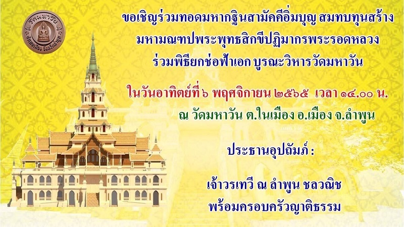 เจ้าวรเทวี ณ ลำพูน ชลวณิช คณะลูกหลานเจ้านายฝ่ายเหนือ พร้อมครอบครัวญาติธรรม และนาวาอากาศเอก(พิเศษ)คัมภีร์ คัมภีรญาณนนท์ ประธานกรรมการบริหาร บริษัท เมืองเศรษฐกิจพอเพียง จำกัด, ประธานคณะปวงชนชาวไทย เพื่อชาติ ศาสน์ กษัตริย์ และประธานฝ่ายฆราวาส สภาประชาชนแห่งชาติ ขอเชิญร่วมทอดมหากฐินสามัคคีอิ่มบุญ เพื่อสมทบทุนสร้างมหามณฑปพุทธสิกขีปฏิมากรพระรอดหลวง และร่วมพิธียกช่อฟ้าเอก บูรณะวิหารวัดมหาวัน ทอดถวาย ณ วัดมหาวัน ต.ในเมือง อ.เมือง จ.ลำพูน ในวันอาทิตย์ที่ 6 พฤศจิกายน 2565 เวลา 14.00 น.