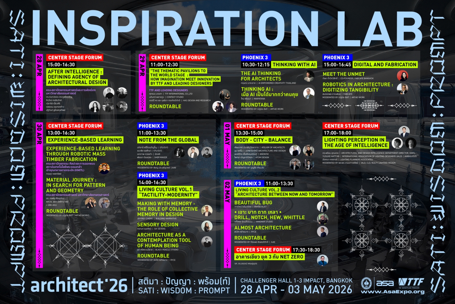 สำหรับ ASA INSPIRATION LAB ยังมีหัวข้อเสวนาและกิจกรรมอีกมาย ซึ่งได้เชิญวิทยากรมาร่วมแชร์ไอเดียกันครอบคลุมทั้งเรื่องของมนุษย์และเทคโนโลยีสมัยใหม่อย่าง AI ตั้งแต่เรื่อง สัมผัสของมนุษย์, สมดุลระหว่างจิตใจและร่างกาย, การทํางานเชิงฝีมือช่างและท้องถิ่น, การทํางานกับบริบททางประวัติศาสตร์และวัฒนธรรมร่วมสมัย, มุมมองการออกแบบในเวทีโลก, ไปจนถึงการทํางานเชิงทดลองกับ Robotic และ Artificial Intelligence กิจกรรมทั้งหมดรวบรวมนักออกแบบ สถาปนิก นักคิด และผู้เชี่ยวชาญระดับแนวหน้าจากทั้งประเทศไทยและนานาชาติ มาร่วมแบ่งปันประสบการณ์ แนวคิด และการทดลองใหม่ๆ ที่กําลังขับเคลื่อนอนาคตของงานออกแบบ