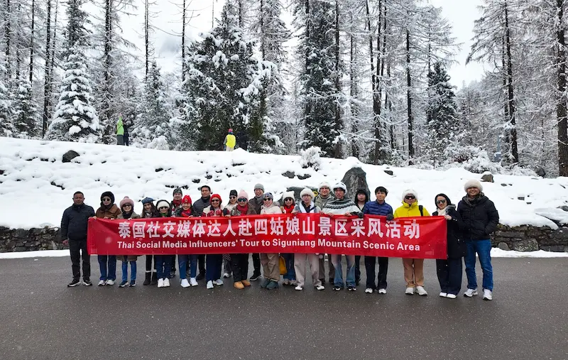 จากนั้นคณะเดินทางต่อผ่านเมืองคังติ้ง แอ่งน้ำสีแดงหงไห่จื่อ จุดชมวิวภูเขากงก้า และทุ่งหญ้าต้ากง ก่อนจะมาถึงเมืองซื่อกูเหนียงในอำเภอเสี่ยวจิน เมื่อวันที่ 13 เมษายน ขณะเยี่ยมชมหุบเขาซวงเฉียว นักท่องเที่ยวชาวไทยได้พบกับหิมะฤดูใบไม้ผลิที่โปรยลงมาจนเปลี่ยนผืนป่าให้กลายเป็นทิวทัศน์ขาวโพลนสุดน่าตื่นตา