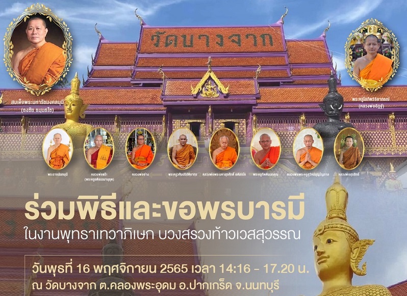 วัดบางจาก จ.นนทบุรี ขอเชิญชวนพี่น้องชาวจังหวัดนนทบุรี และจังหวัดใกล้เคียง ร่วมพิธีและขอพรบารมี ในงาน “พุทธาเทวาภิเษก บวงสรวงท้าวเวสสุวรรณ” โดยมีประธานฝ่ายสงฆ์ ท่านเจ้าประคุณ สมเด็จพระมหารัชมงคลมุนี วัดไตรมิตรวิทยารามวรวิหาร, พระครูโสภิตวิริยาภรณ์ (หลวงพ่ออิฏฐ์) เจ้าอาวาส วัดจุฬามณี และเกจิจากวัดต่าง ๆ มาร่วมพิธีนั่งปรกและสวดภาณยักษ์ ส่วนประธานฝ่ายฆราวาสได้รับเกียรติจาก รศ.ดร.พิชนี โพธารามิก ซึ่งพิธีจัดขึ้นวันพุธที่ 16 พฤศจิกายน 2565 ตั้งแต่เวลา 14.00 น. เป็นต้นไป ณ วัดบางจาก ต.คลองพระอุดม อ.ปากเกร็ด จ.นนทบุรี