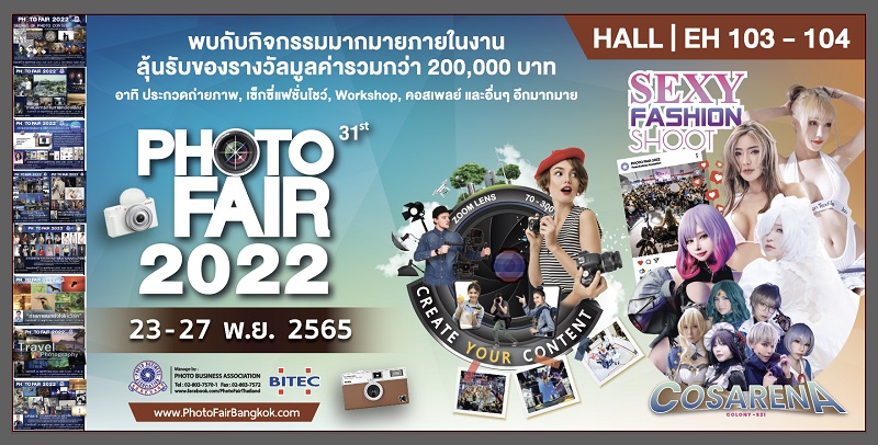 กิจกรรมงาน PHOTO FAIR 2022 กับคอนเซปต์ “Create Your Contents” สร้างสรรค์ผลงานด้วยตัวคุณเอง งาน PHOTO FAIR 2022 จัดขึ้นระหว่างวันที่ 23 -27 พฤศจิกายน 2565 ณ ศูนย์นิทรรศการและการประชุมไบเทค บางนา ภายในงานจะมีบูธแบรนด์กล้องจากทุกค่าย แบรนด์ดัง สินค้าเทคโนโลยีกล้องถ่ายภาพและอุปกรณ์การถ่ายภาพ นอกจากนี้ยังมีโซนกล้องมือสอง กล้องฟิล์มหายาก ฟิล์มกล้องหลากหลายรุ่นกล้องดิจิตอลมือสอง อุปกรณ์ไลฟ์สด อุปกรณ์สำหรับนักขายออนไลน์ มาให้ผู้ที่มาในงานได้สัมผัสทดลองก่อนตัดสินใจ และยังมีกิจกรรมสัมมนาเทคนิคการถ่ายภาพ กิจกรรมประกวดการถ่ายภาพและคลิปวีดีโอสั้นแบบเรียล มูลค่า 200,000 บาท , กิจกรรมคอสเพลย์ ในชื่อ Cos Arena 2022 กิจกรรมแจกส่วนลด และลุ้นรับของรางวัลกล้องและอุปกรณ์ถ่ายภาพ รางวัลมูลค่ากว่า 400,000 บาท